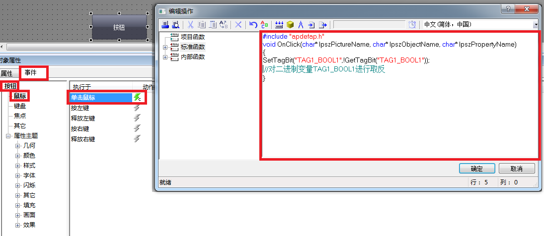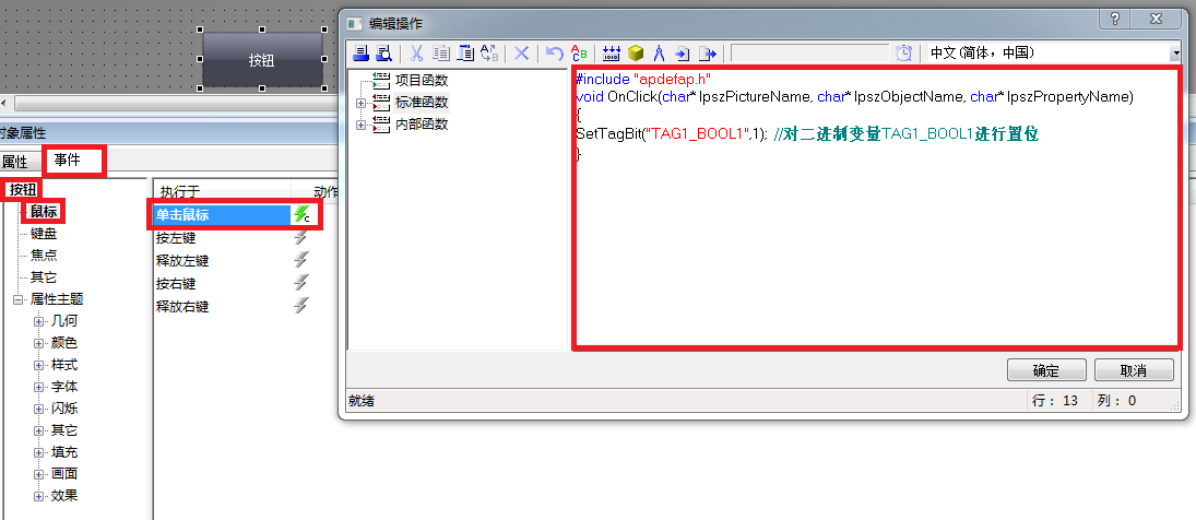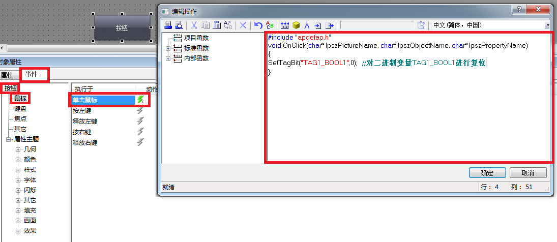 (1) 按钮-->对象属性-->事件-->单击鼠标C动作填入代码如下
