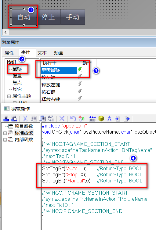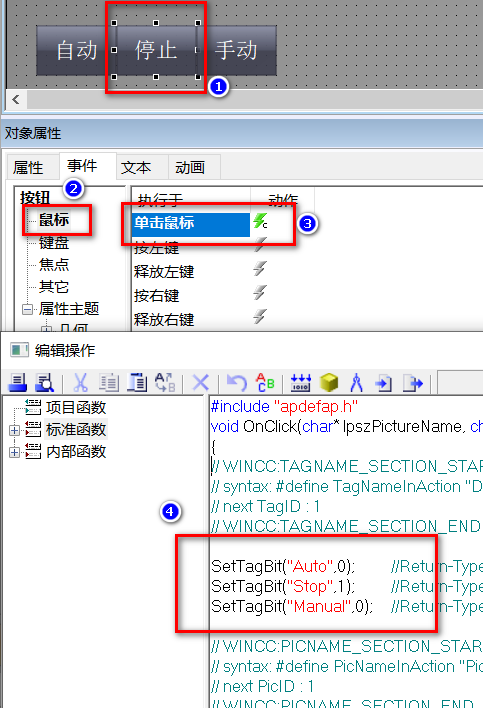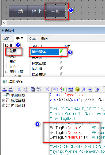 在手动按钮的鼠标事件中添加C脚本,代码的含义为置位Manual手动变量,复位Stop停止变量/Auto自动变量。