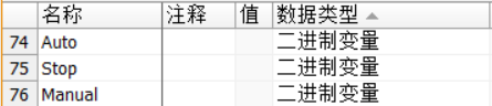在WinCC项目中创建3个二进制变量,Auto=自动,Stop=停止,Manusl=手动。