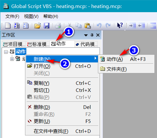 打开VBS脚本编辑器后,选择“动作”栏,在下面的“动作”上右键,选择“新建->动作”。