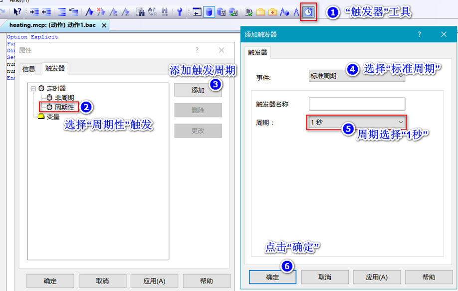 下面需要设置变量自加1的脚本每秒执行一次,这是通过设置全局动作脚本的“触发器”来实现的。按照如下步骤,设置脚本周期性的每秒执行一次。