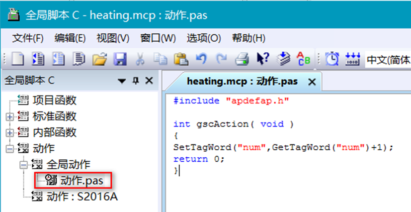 在脚本编辑器中编写变量“num”自加1的脚本,如下图所示。