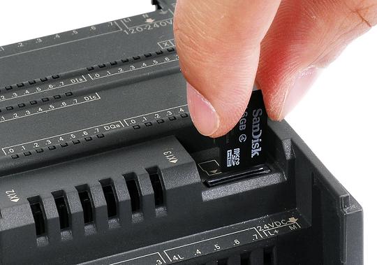 打开CPU本体数字量输出点上方的端子盖,可以看到右侧有一卡槽,将MicroSD卡缺口向里插入,如图 1所示: