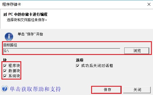打开"程序存储卡"对话框,选择需要被拷贝到存储卡上的块(程序块、系统块、数据块), 单击"浏览"按钮,导航至SD卡的根文件夹,如图5所示: