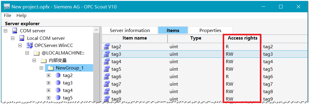 当使用 OPC Scout V10 做为 OPC 客户端浏览 WinCC 变量时,无法看到使能“读保护”的那些变量。如下图所示。
