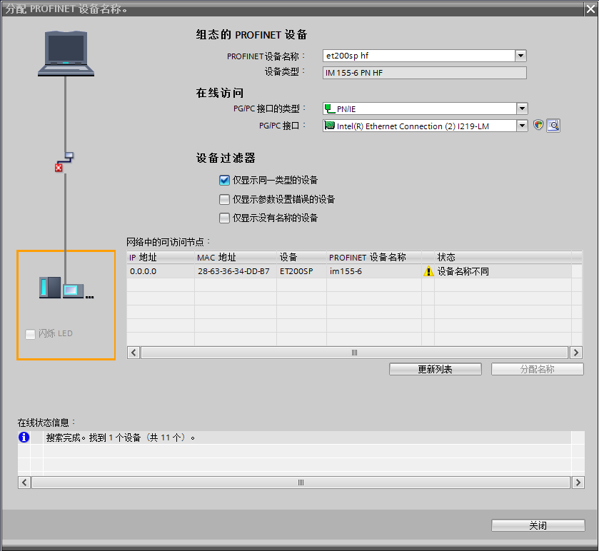 如果此时待分配设备名称的ET200SP状态显示“设备名称不同”,则此时组态的离线设备名称(“et200sp hf”)与在线设备名称不同(“im155-6”),如图11所示。