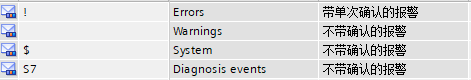 默认的类别中,Errors类别是带单次确认的报警,具有“到达/离开/确认”三种状态,而Warnings类别是不带确认的报警,只具有“到达/离开”两种状态。