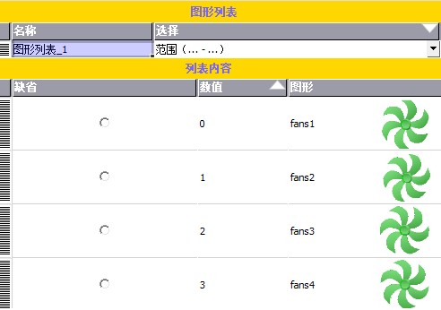 步骤2. 添加图形列表,模式选择为范围,在图形列表内容中添加多个不同角度的风机图片。如下图所示。