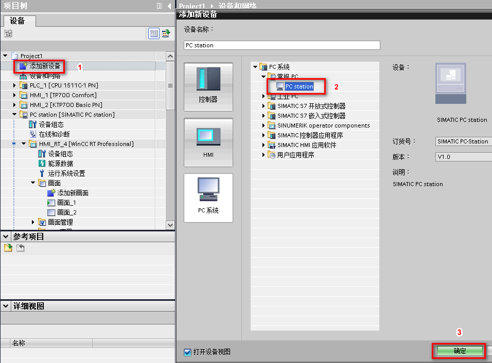 在项目树中双击“添加新设备”,并在弹出界面中选择“常规PC”中的“PC Station”后点击“确定”。