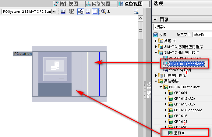 将界面右侧“硬件目录”中的 "Simatic HMI 应用软件“中的 ”WinCC RT Professional“ 及 ”通信模块“-”PROFINET/Ethernet“中的”常规 IE”点击鼠标左键拖拽至下图处。