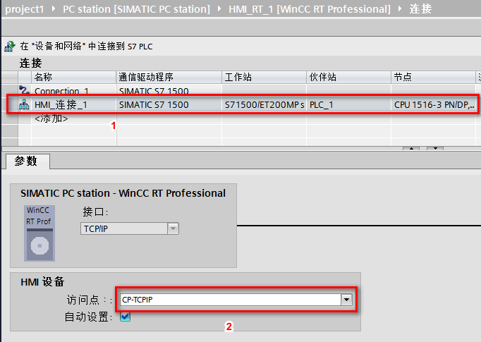 在打开的界面中,点击建立的连接,并将连接的访问点设置为 "CP-TCPIP"。