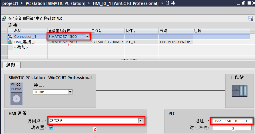在弹出界面中点击”添加“新建连接,选择通信驱动程序为S7-1500,设置对应PLC通信端口的 IP 地址,在访问点处选择 ”CP-TCPIP“。连接即建立完毕。