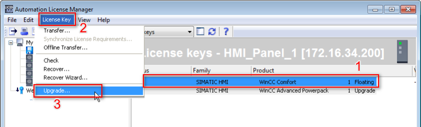 第二步:选中待升级的授权;选择“License > Upgrade”(“许可证密钥 > 升级”)命令,执行授权升级。