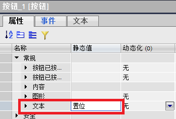 2.组态按钮的显示文本,在按钮的“属性>常规>文本”静态值中输入“置位”。如下图所示: