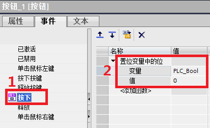 3.在按钮“事件>按下”中调用“置位变量中的位”函数,变量选择“PLC_Bool”。如下图所示: