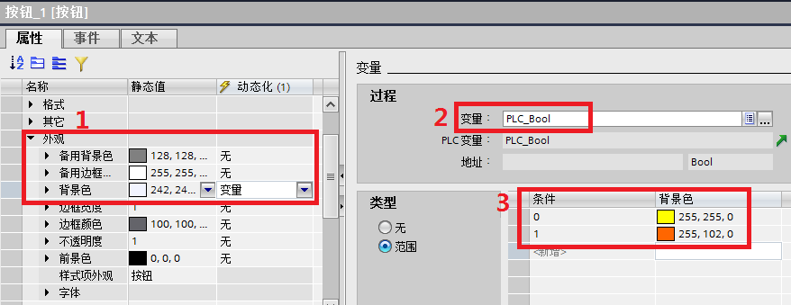 4.在按钮“属性>外观>背景颜色”动态化”中选择“变量”,在过程变量中关联“PLC_Bool”,在为0和1的条件下设置不同的颜色。如下图所示: