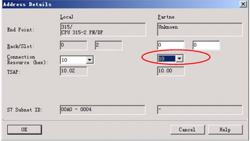4:完后点击按钮“Address Details… ”, 在弹出的对话框中的Partner 列中选择连接资源 10,如下图所示:该参数会在WinCC的连接中使用: