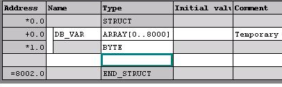 建立共享数据块DB1作为发送到WinCC的数据区(或用来接收WinCC的数据),在其中定义一个含有8000个字节元素的数组: