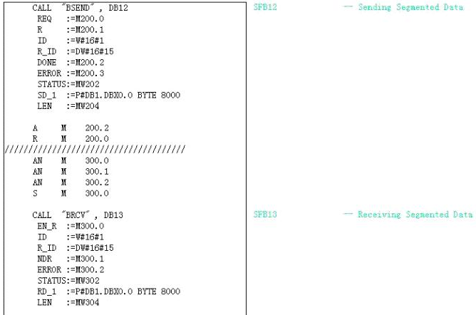 打开OB1,在语句表状态下输入“CALL SFB12, DB12”回车, 这样会自动将 SFB12 /BSEND函数和其背景数据块自动生成,同样调用“CALL SFB13, DB13”,具体示例程序如下: