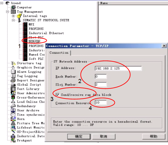 打开WinCC新建项目。在变量管理器中添加通道“Simatic S7 Protocol Suite”,然后右键单击 “TCP/IP”,添加“新驱动程序连接”,参照下图设置: