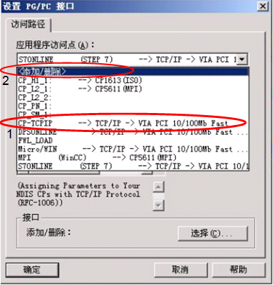 双击“设置PG/PC接口”,弹出对话框,在下拉菜单中选择“CP-TCPIP” 项(如下图所示的 1)。如果没有该项,选择“<添加/删除>”(如下图所示的 2),添加一个 “CP-TCPIP” 访问节点。然后将该访问节点指向实际的物理网卡(如下图所示的 1)。
