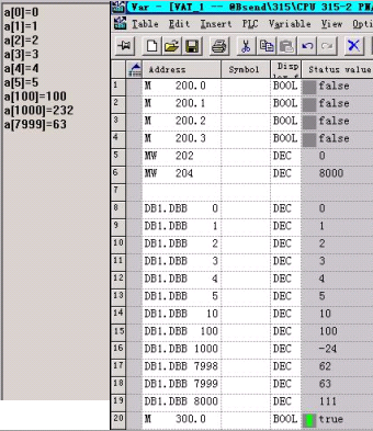 写入操作:在WinCC运行画面中点击按钮SetRawData,数组a[8000]将被写入到PLC,注意因为M300.0 空闲时一直为1,即BRCV的EN_R处于使能状态,故可以随时接收WinCC的写入数据。