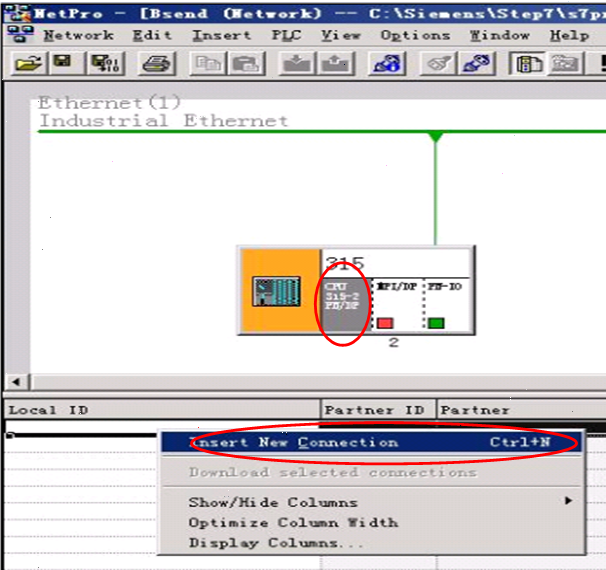 点击工具栏上的NetPro按钮或点击菜单“Option”->“Configure Network”,打开NetPro编辑器。 点击选中S7-300站中的CPU315-2PN/DP,然后右键单击下面列表的空白处,出现菜单,如下图所示: