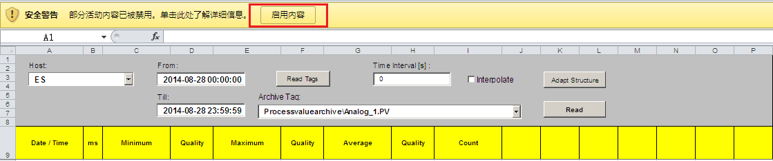 首先,打开项目,激活运行系统;然后打开之前下载的OLE-DB Tag and Alarm Export.xls文件,启用宏,如图2-2所示。