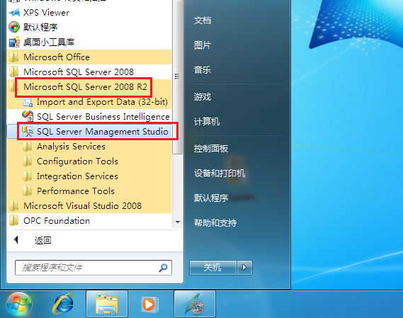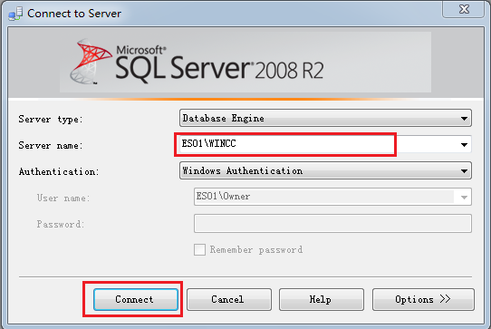打开 开始菜单 -> 所有程序 -> Microsoft SQL Server 2008 R2 -> SQL Server Management Studio,如图3-1所示。在弹出的数据库对话框中,Server Name 选择为 “ES01\WinCC”,其中ES01为本例的本地计算机名,点击Connect,如图3-2所示。