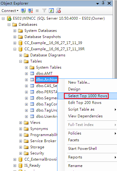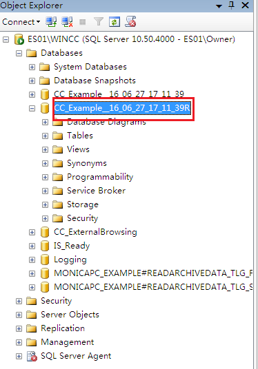 在左侧的Databases下选择WinCC项目对应的运行数据库,数据库的名称规则为CC_项目名称_日期_时间R,本例为CC_Exmaple_16_06_27_17_11_39R,如图3-3所示。