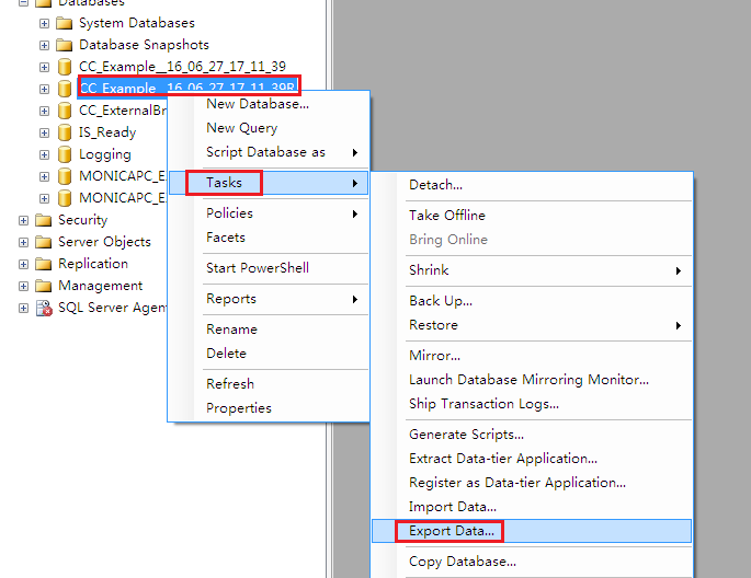 1.启动导出向导。右击WinCC项目的 运行数据库,选择Tasks -> Export Data,如图3-6所示。在弹出的SQL Server Import and Export Wizard中点击下一步,如图3-7所示。