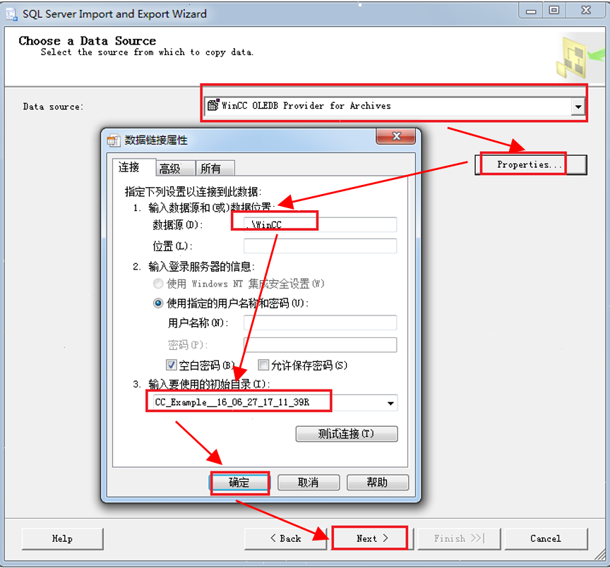 2.选择导出数据源。Data Source选择WinCC OLEDB Provider for Archives;点击Properties设置数据连接属性,数据源设置为“.\WinCC”,初始目录设置为项目的运行数据库名称,本例为CC_Exmaple_16_06_27_17_11_39R,点击OK,然后进入下一步,如图3-8所示。为了改善本地访问期间的性能,推荐在数据源中输入“<计算机名称>\WinCC”,如:“ES01\WinCC”。