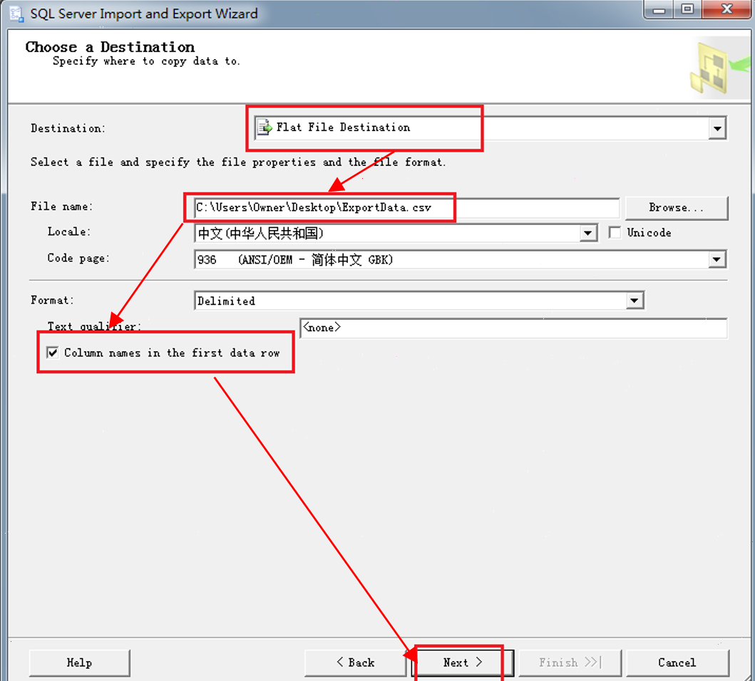3.设置导出文件。Destination 处设置为Flat File Destination,File Name处输入待导出的CSV文件的文件名(不需要提前创建),勾选Column names in the first data row,点击下一步, 如图3-9所示。