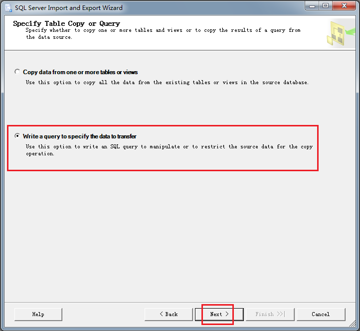 选择Write a query to specify the data to transfer,点击下一步,如图3-10所示。