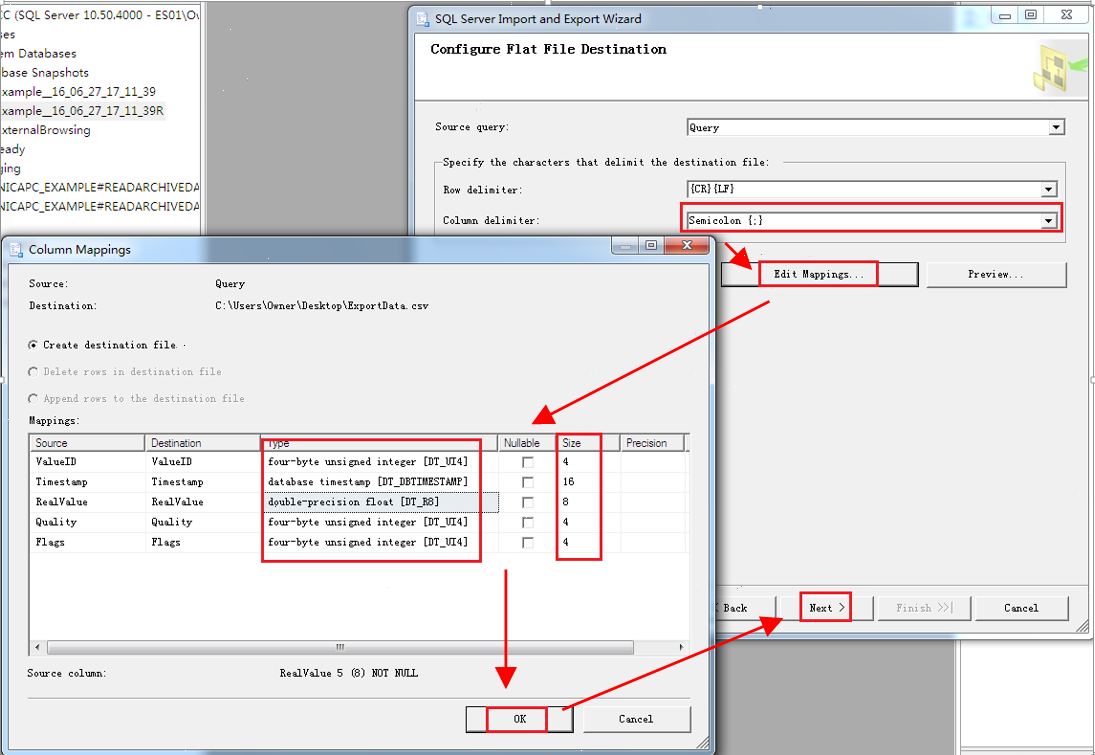 5.设置导出文件的数据格式。将Column delimiter选为Semicolon{;},然后点击Edition Mappings,按照表3-1进行设置数据类型和字节长度,然后点击OK保存,如图3-12所示。可以点击Preview进行预览,确认无误后,即可点击下一步。
