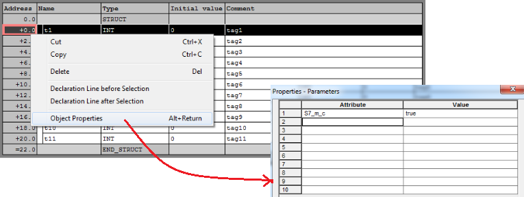 在PLC程序中打开需要上传变量的DB块,并选择相应变量,右键选择“对象属性”,在属性对话框中为Attribute输入 “S7_m_c” (注意大小写),Value输入“true”。