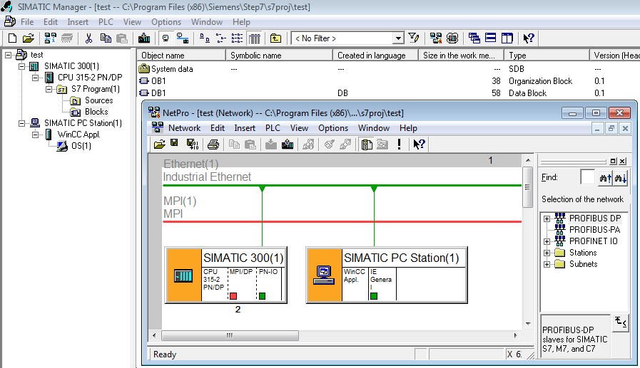 在Step7中插入PLC及WinCC Application,并将它们连接到同一个网络上。
