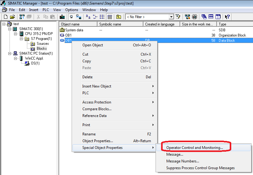 对需要上传的变量重复上面的操作,然后保存并关闭DB块。选中DB块,右键选择“Special Object Properties”à“Operator Control and Monitoring...” 。