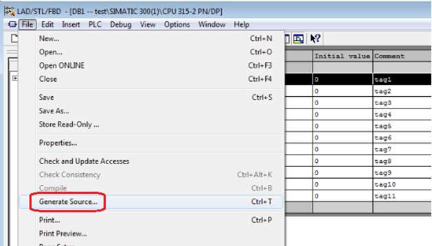 在Step7中打开相应的DB块,选择菜单“File”->“Generate Source”(图11),为源文件命名(图12) 。