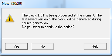 注意,如果在图13中选择的DB块在打开状态,生成源文件时会有如下提示,直接确认即可。
