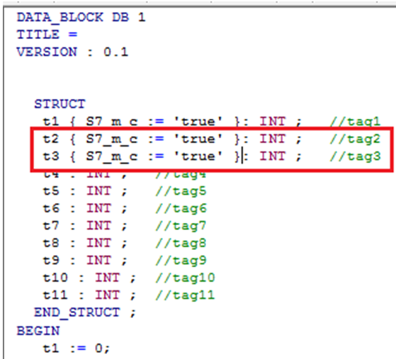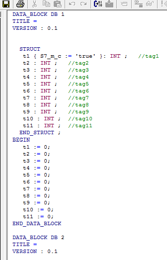直接打开源文件如下图所示,其中变量名后的{}内的文本代表变量的属性及属性值,例如下图中的“{S7_m_c:=' true '}”,就代表DB1中的t1变量的S7_m_c属性为true。