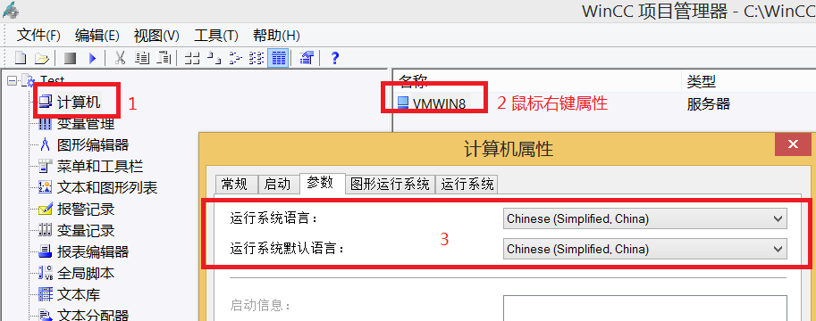 WinCC项目从一台电脑复制到另外一台电脑,或者从低版本移植到高版本,在编辑画面中对象文本显示问号(??)或者乱码,多半是由于画面编辑语言选择错误。