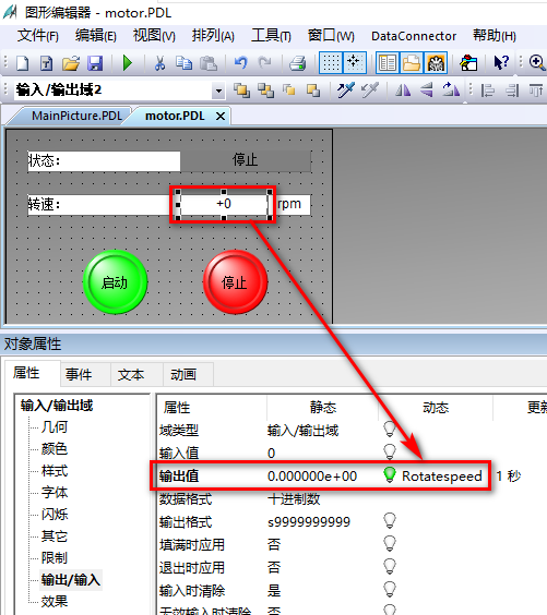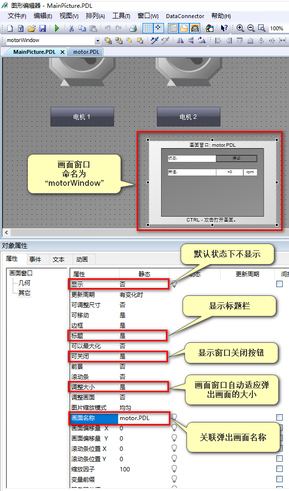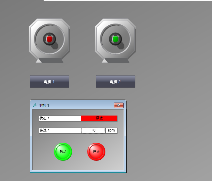按常规组态方法组态弹出的子画面。在子画面中组态的所有变量连接都将变量前缀删除,包括脚本中的变量。例如电机状态关联的变量 motor1State、motor2State ,仅保留 State 。转速 motor1Rotatespeed 、 motor2Rotatespeed 仅保留 Rotatespeed 如图 3 。