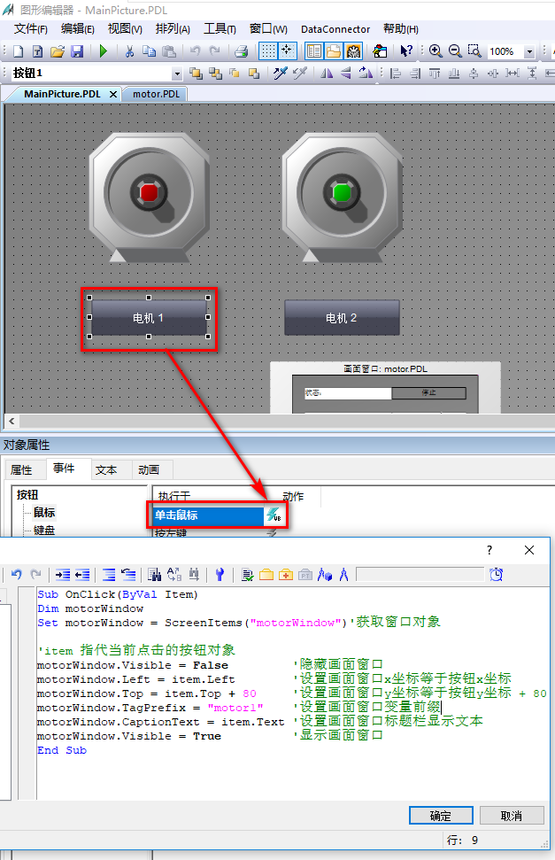 在主画面上组态打开弹出画面的按钮并添加脚本如下: