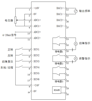 本地:5号端子控制正转,模拟量输入1电位器调速(或0~10V);