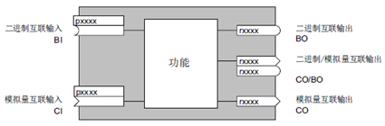 “CO:”,“CO/BO:” 它们就是BICO参数。可以通过 BICO 参数确定功能块输入信号的来源, 确定功能块是从哪个模拟量接口或二进制接口读取输入信号的, 这样您便可以按照自己的要求,互联设备内各种功能块了。 下图展示了五种 BICO 参数: