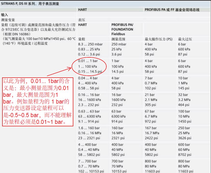 以SITRANS P DSⅢ系列,用于测表压的7MF4033为例,压力变送器的测量范围和最大操作压力如下: