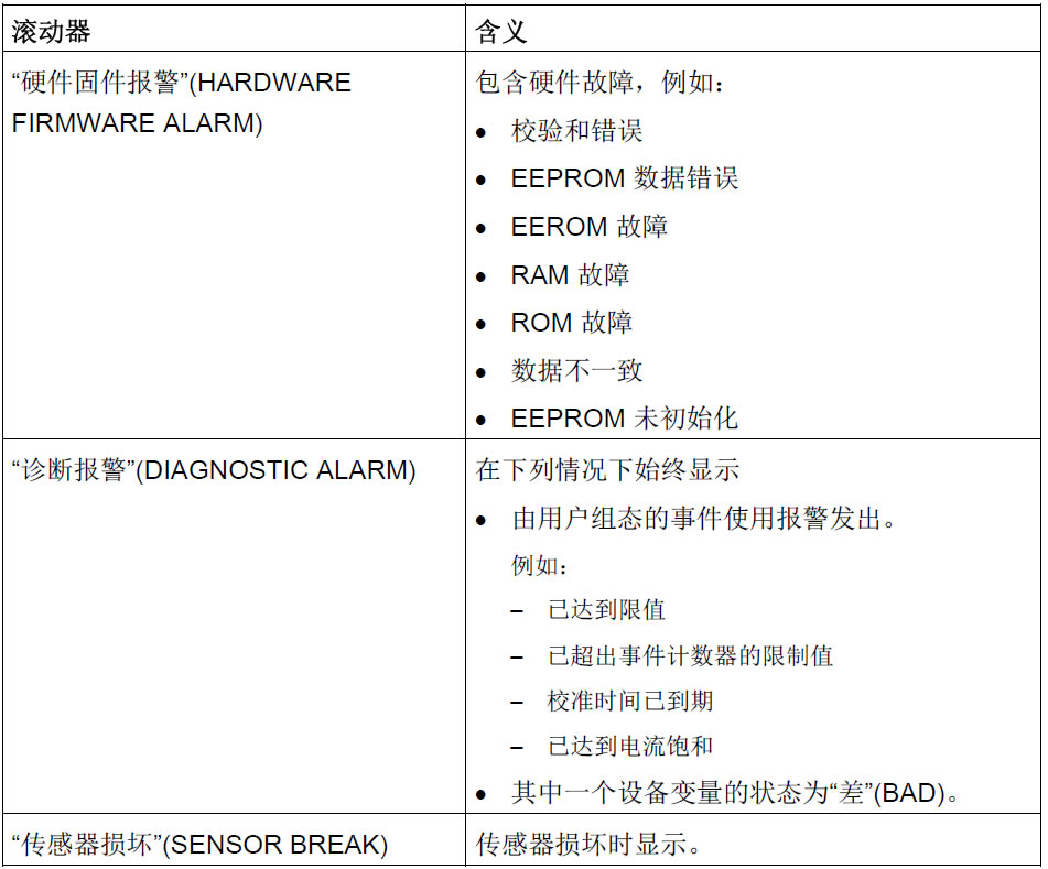 压力变送器中出现硬件故障、软件故障或诊断报警,会在测量值显示屏中显示消息Error。滚动显示出现在显示屏底部一行中,用于指示错误类型。