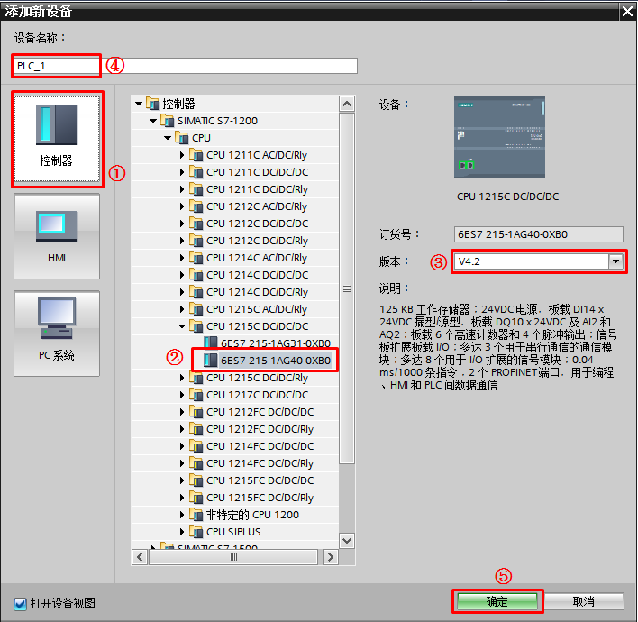 下面介绍在项目视图中如何进行项目硬件组态。进入项目视图,在左侧的项目树中,单击“添加新设备”,如图 3 所示,随即弹出添加新设备对话框,如图 4 所示。在该对话框中选择与实际系统完全匹配的设备即可。