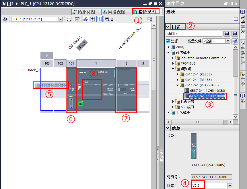 在添加完成新设备后,与该新设备匹配的机架也会随之生成。所有通信模块都要配置在 S7-1200 CPU 左侧,而所有信号模块都要配置在 CPU 的右侧,在 CPU 本体上可以配置一个扩展板。配置方法如图 5 所示。